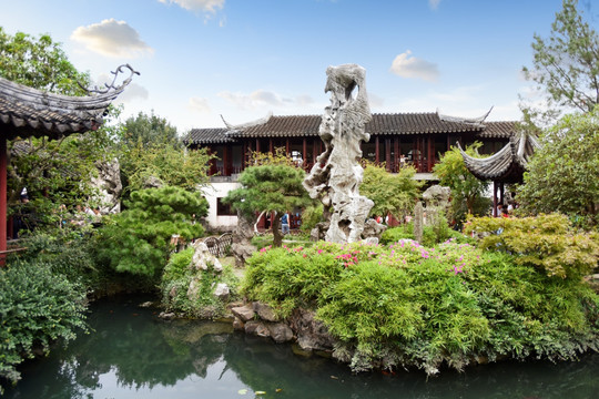 留园里最出名的还得是冠云峰,这石头可有年头了,说是宋徽宗当年花石纲的遗物,沉在水里几百年才被捞上来。站在跟前看,石身全是孔洞,太阳光穿过去能在地上投下晃悠悠的影子,表面的褶子跟老人的皱纹似的,难怪说它集齐了 “瘦、漏、皱、透” 这四样宝贝。旁边的瑞云峰、岫云峰是后来配的,三个石峰站在那儿,周围的冠云楼、冠云台好像都是为了陪衬它们建的。