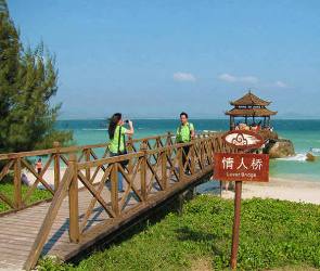 桥的尽头连着海中礁石上的亭子,站在那儿能看见 6-27 米深的玻璃海,底下小鱼游来游去,海风一吹整个人都飘了。旁边的情人岛更有意思,两座大石头是龙王女儿和打鱼小伙变的,千百年就这么望着对方,传说在这儿许愿的情侣都能长久。